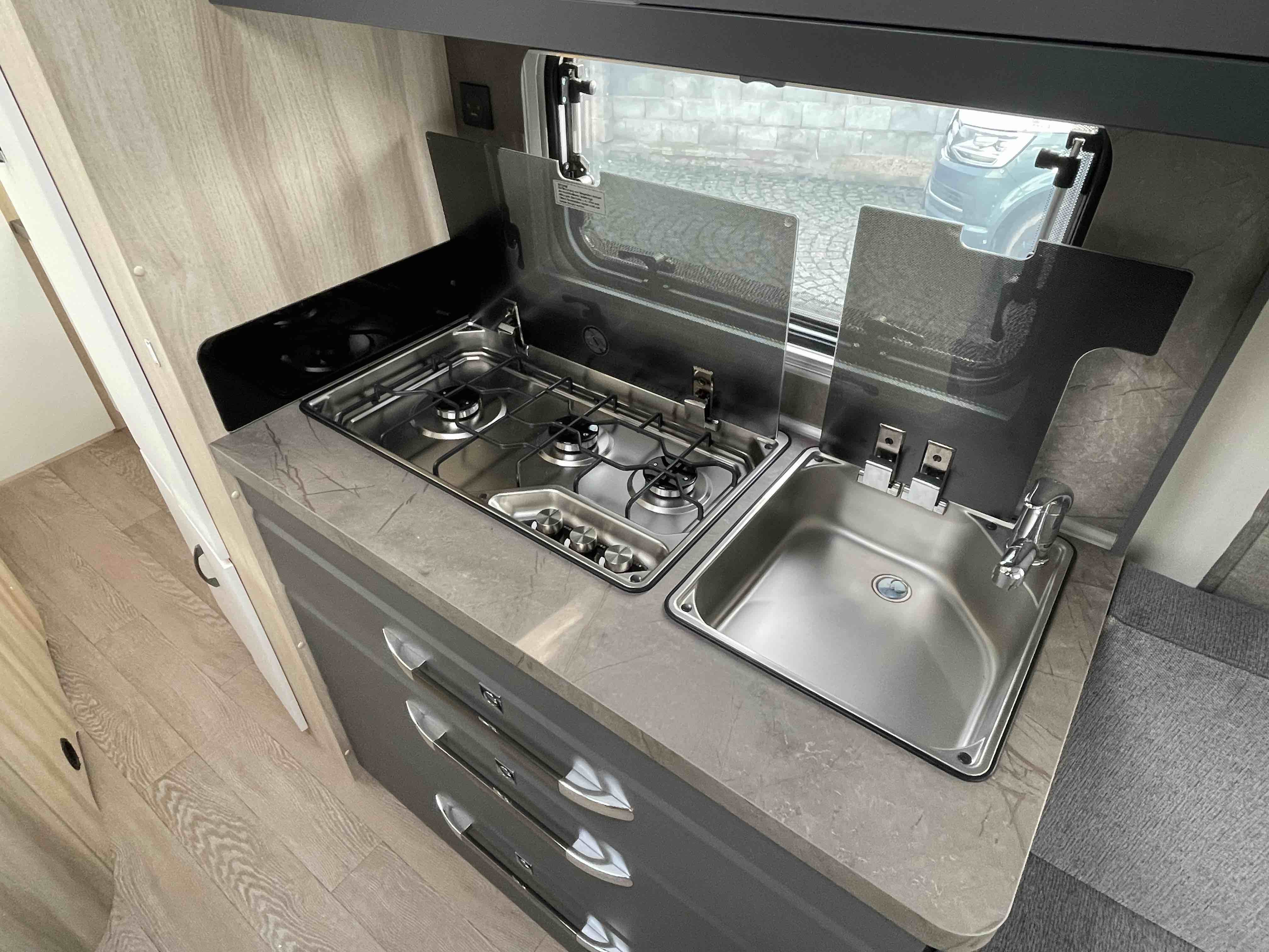 - kombinace sporák-dřez z nerezové oceli s 3 plamenným vařičem, elektrickým zapalováním a dvoudílným skleněným krytem