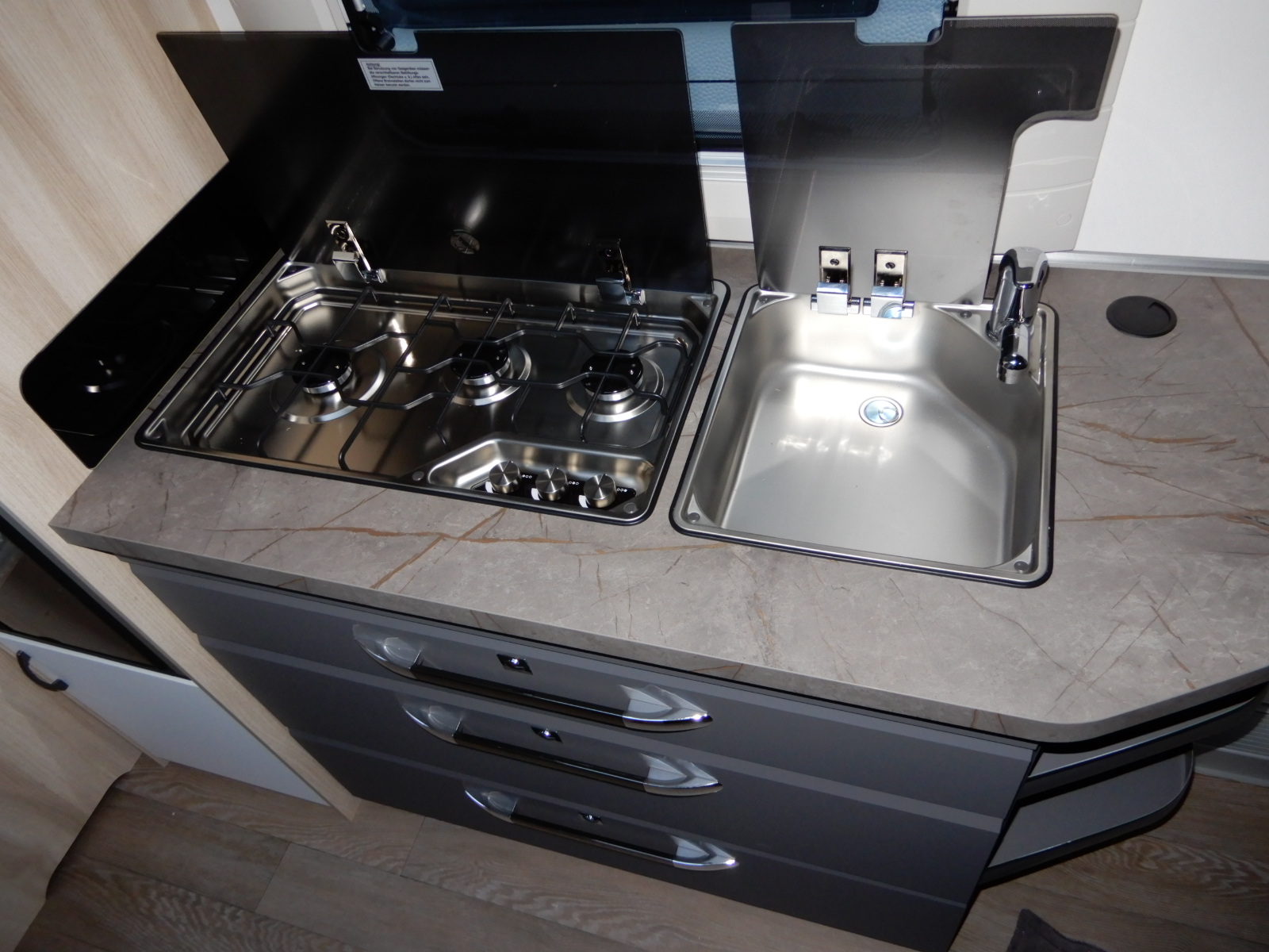 - kombinace sporák-dřez z nerezové oceli s 3 plamenným vařičem, elektrickým zapalováním a dvoudílným skleněným krytem